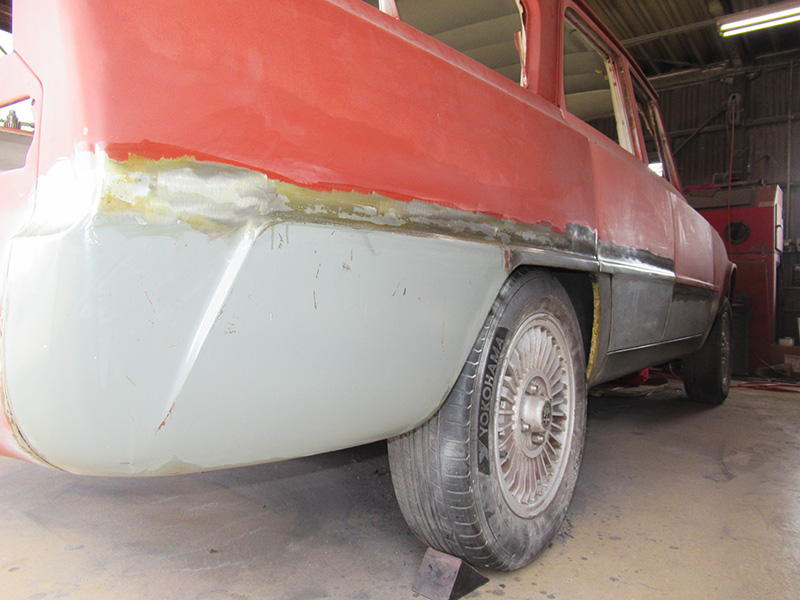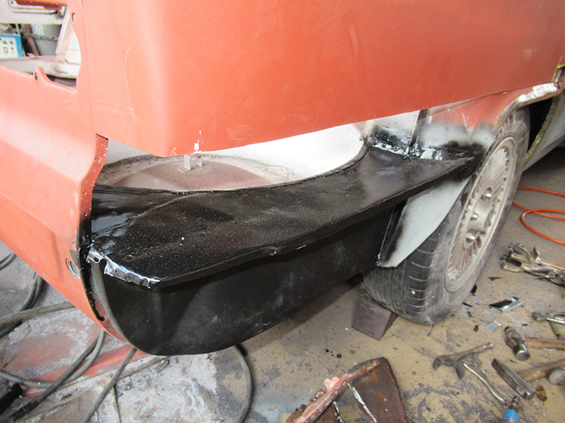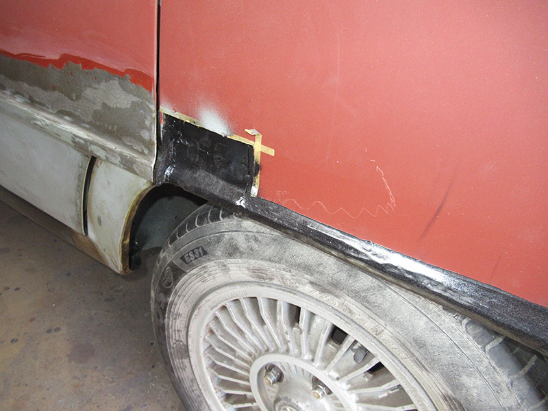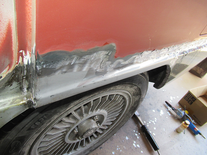 ジュリアT.I、左右側面のパネル張替が終了したところから引き続き、セダンボディーの泣き所、グサグサだったリヤフェンダーアーチからリヤエプロンサイドの作業再開・・・・・・・・