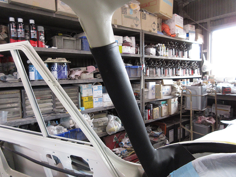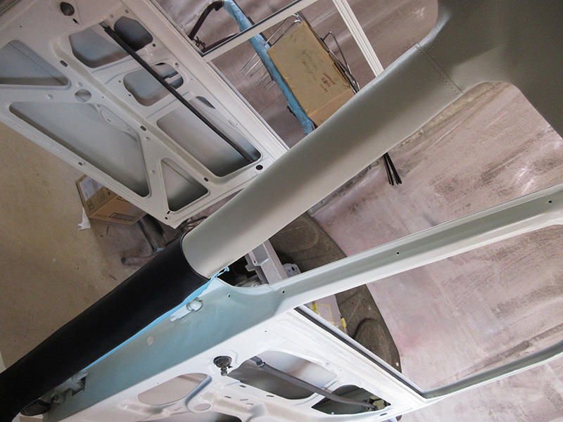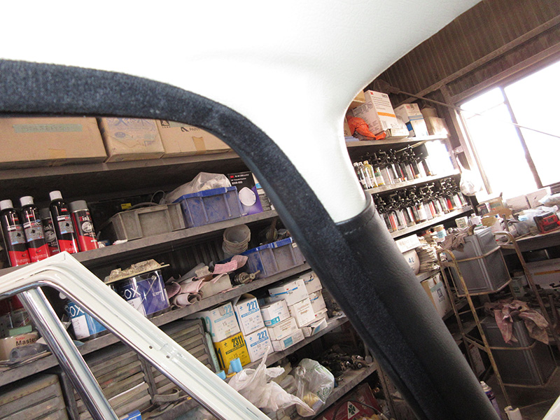 まずはA及びBピラーに新規で制作(トップの折り返し部分はヴィンテージミシンを使用している洋服お直し屋さんにて縫製依頼)されていただいた生地にて貼り付け。