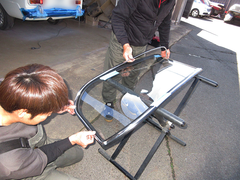 オーナー様に年1回くらいの頻度?で磨いていただくことをご了承済み(笑)にて前後ガラスに付いているアルミモールのラミネート加工剥がし。