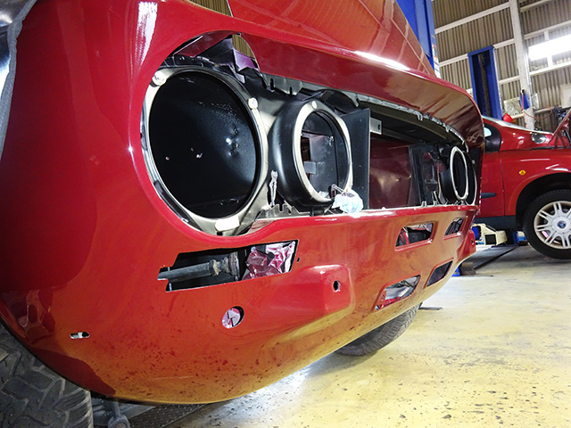 基本、当店ではボディーレストアをさせていただく際はオリジナルの姿に戻すことを心がけて作業をしておりますので、バッテリーをオリジナル同様の場所に戻すにあたり、バッテリートレイをボディーに溶接での取り付け、当初はエンジンを搭載した状態で作業をするはずだったのですが、いかんせん作業スペースの問題や作業性、効率を考えた結果、「え~い、しゃらくさい!」との如く(笑)、急遽エンジンを下ろすことになってしまったわけです・・・・・・・・・たかがバッテリートレイの取り付けとは言え、現実はこんなにも手間を必要とする作業なんですねぇ~コレが。(笑)