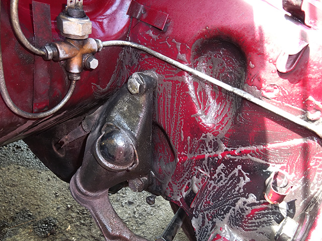 まずは油汚れ落としからサクッと・・・・・・・は、いくはずもなく、数種類のケミカルを駆使しながら飛び散る汚れと格闘、その間作業着がドロドロになろうが、ケミカルが目に入ろうがお構いなしで黙々と作業・・・・