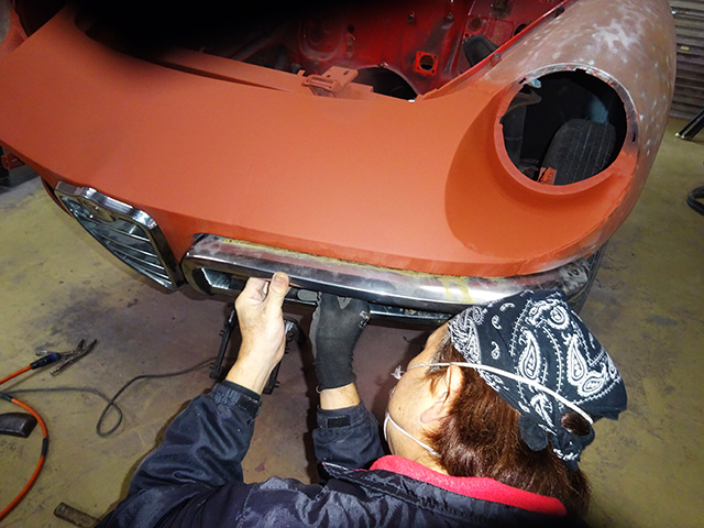 パネルを仮止めし、再度、フロントグリルとフロントバンパーを取り付けての位置決め中・・・・・