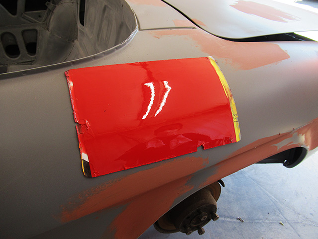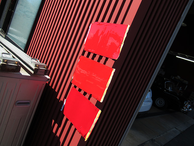 オーナー様にお越しいただきご希望される色をその場で調合、お待ちいただくこと数十分、旧い年代のアルファロメオに使用されていたレッドをイメージした朱色っぽい色の暗め、明るめ、その中間と3種類をご用意。