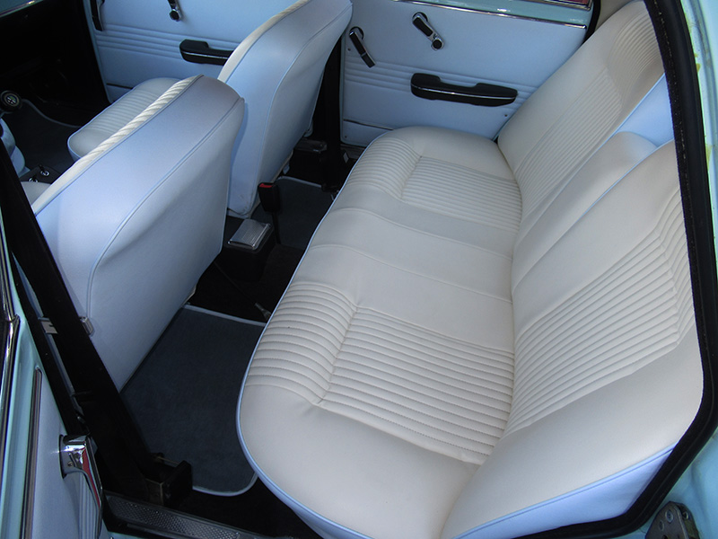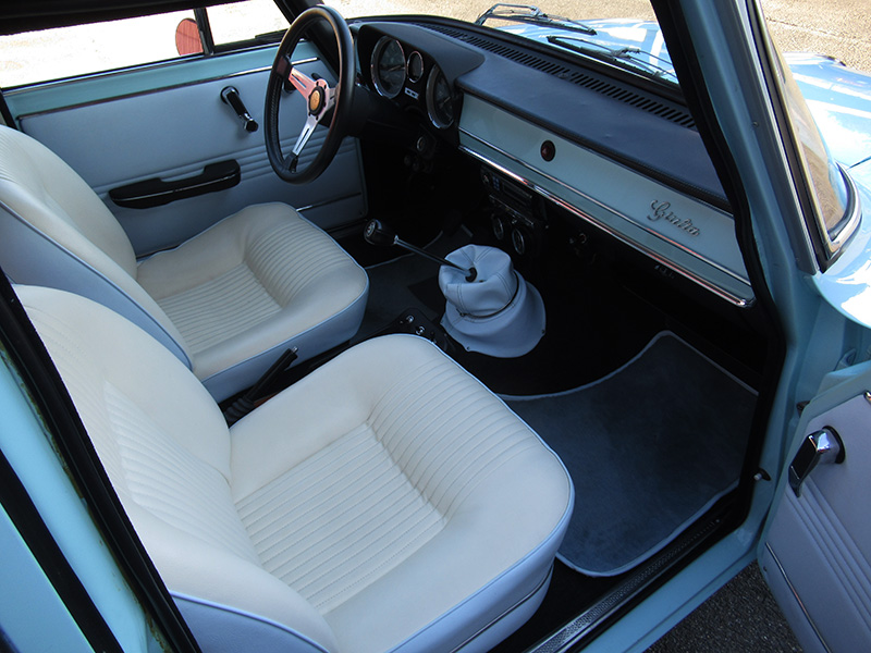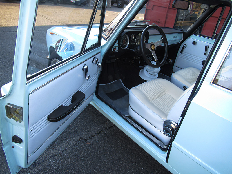 ボディーワーク時に取り外され前後シートを表面はアイボリーホワイト、シートショルダー及び背面、前後左右ドアインナートリム、シフトブーツとお釜をボディー色に合わせたライトブルー系の生地を要いての特注品で張替え、ダッシュボード正面もボディーと同じカラーでペイントと、このような内外装を組み合わせた個体は国内だけでなく海外でも唯一無二の存在かと。(笑)